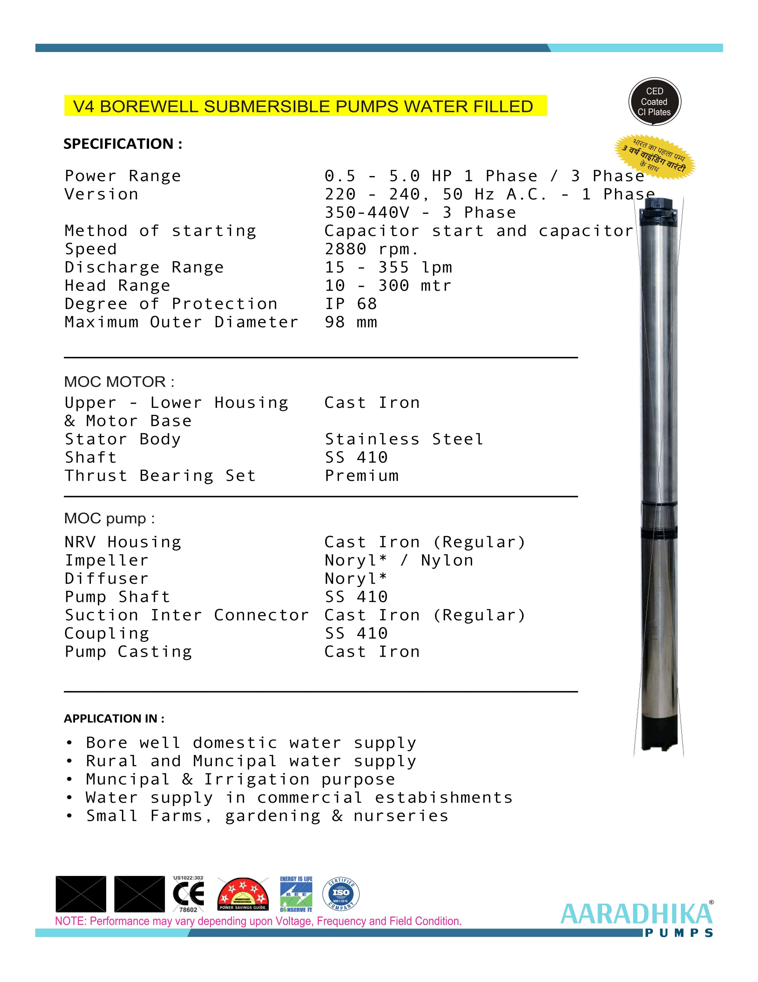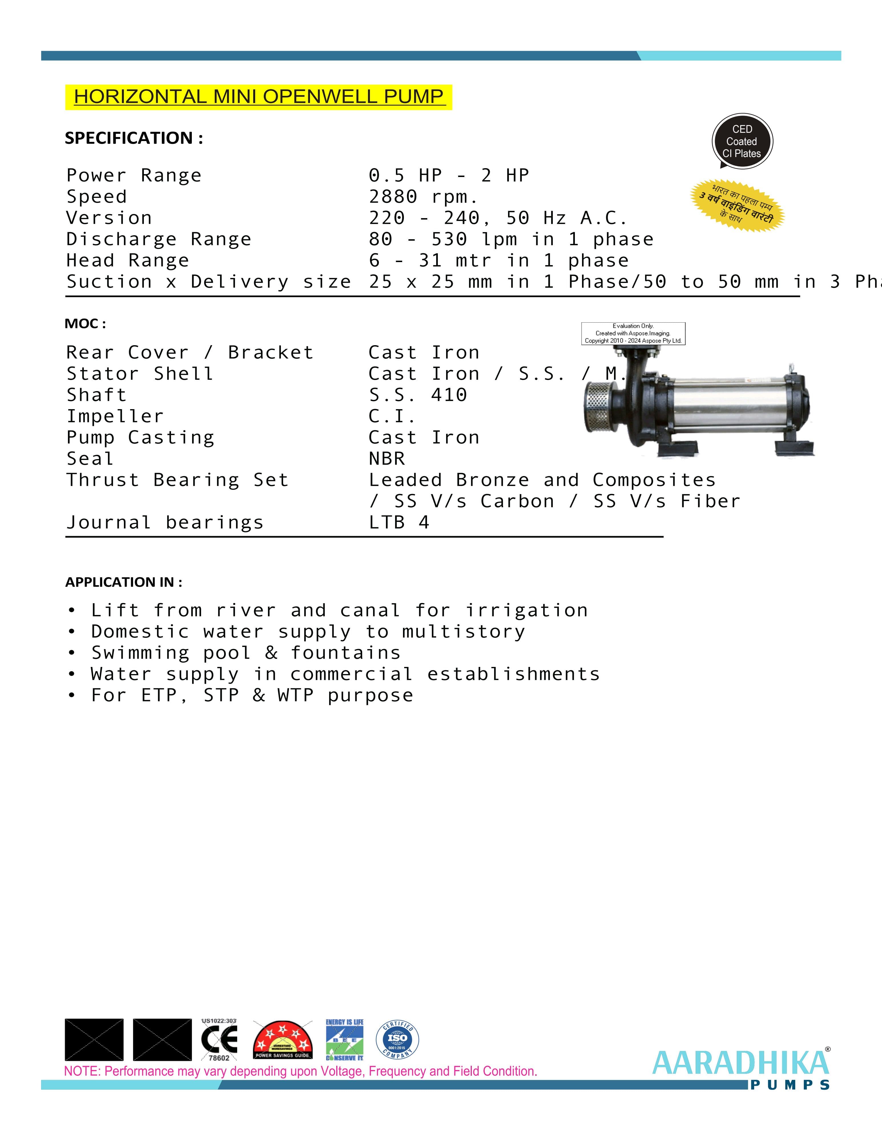 Power Range: 0.5 HP – 2 HP | Speed: 2880 RPM | Voltage Version: 220 – 240V, 50Hz, Single Phase A.C. | Discharge Range: 80 – 530 LPM