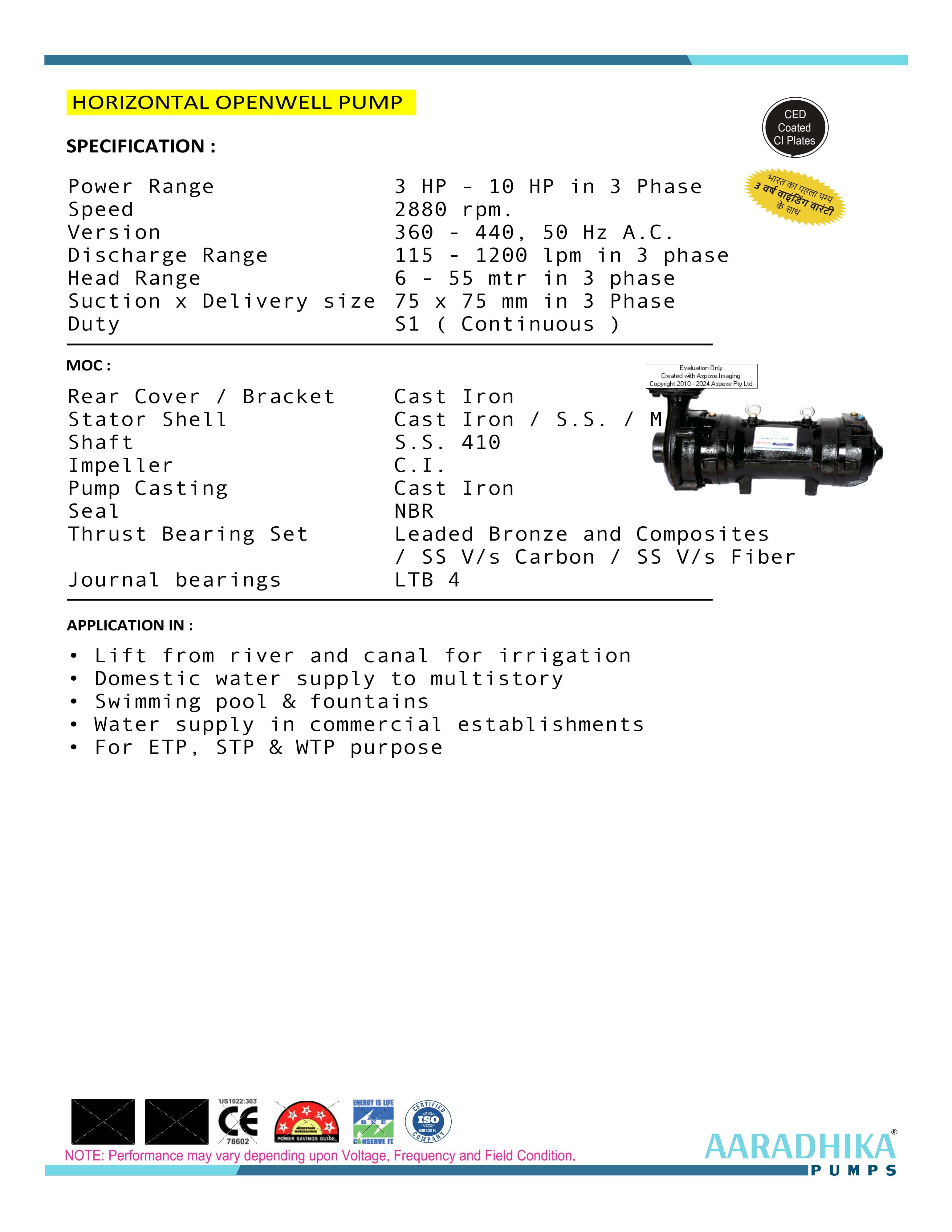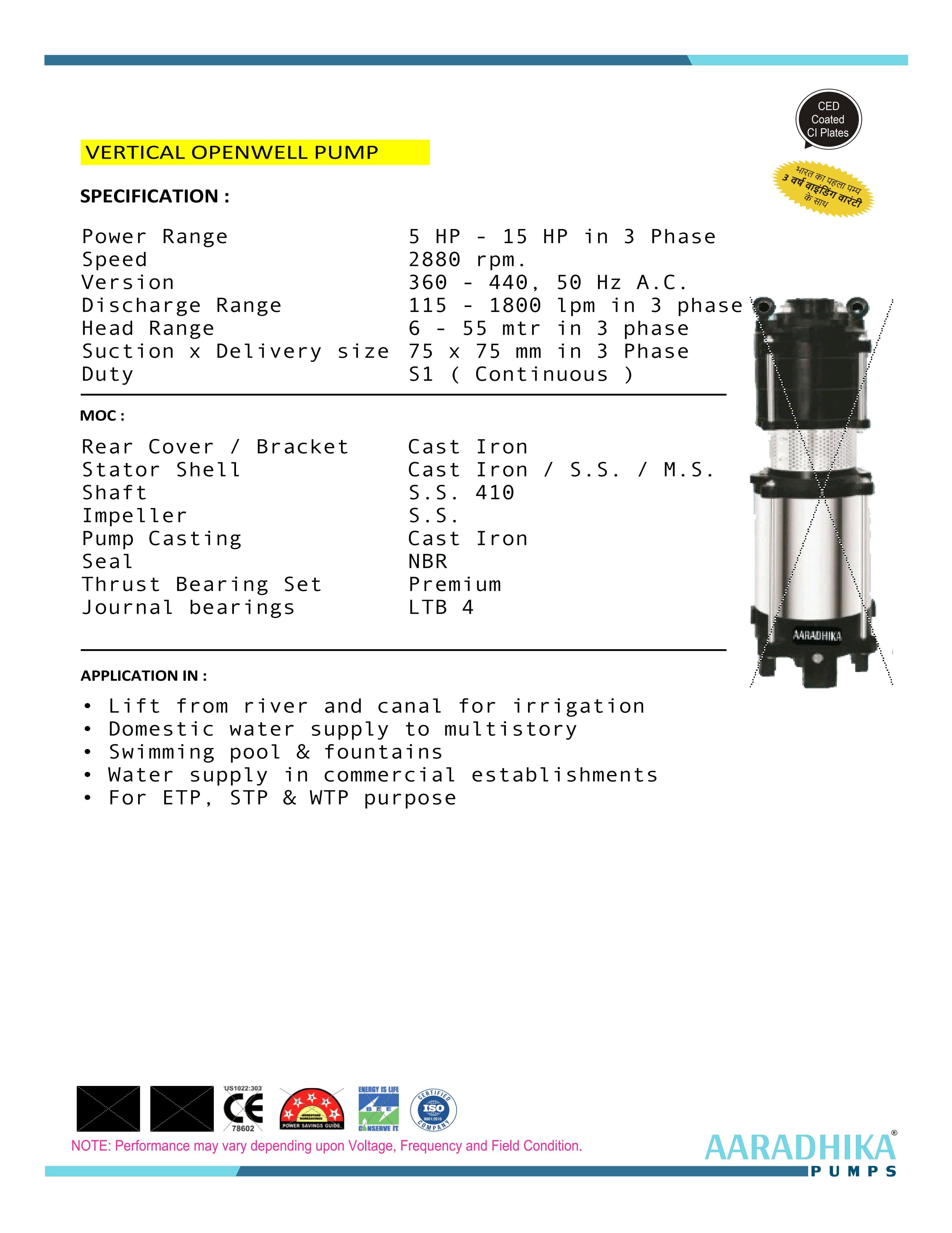 Power Range: 5 HP – 15 HP (3 Phase) | Speed: 2880 RPM | Discharge: 115 – 1800 LPM | Head Range: 6 – 55 Mtrs | Suction x Delivery: 75 x 75 mm