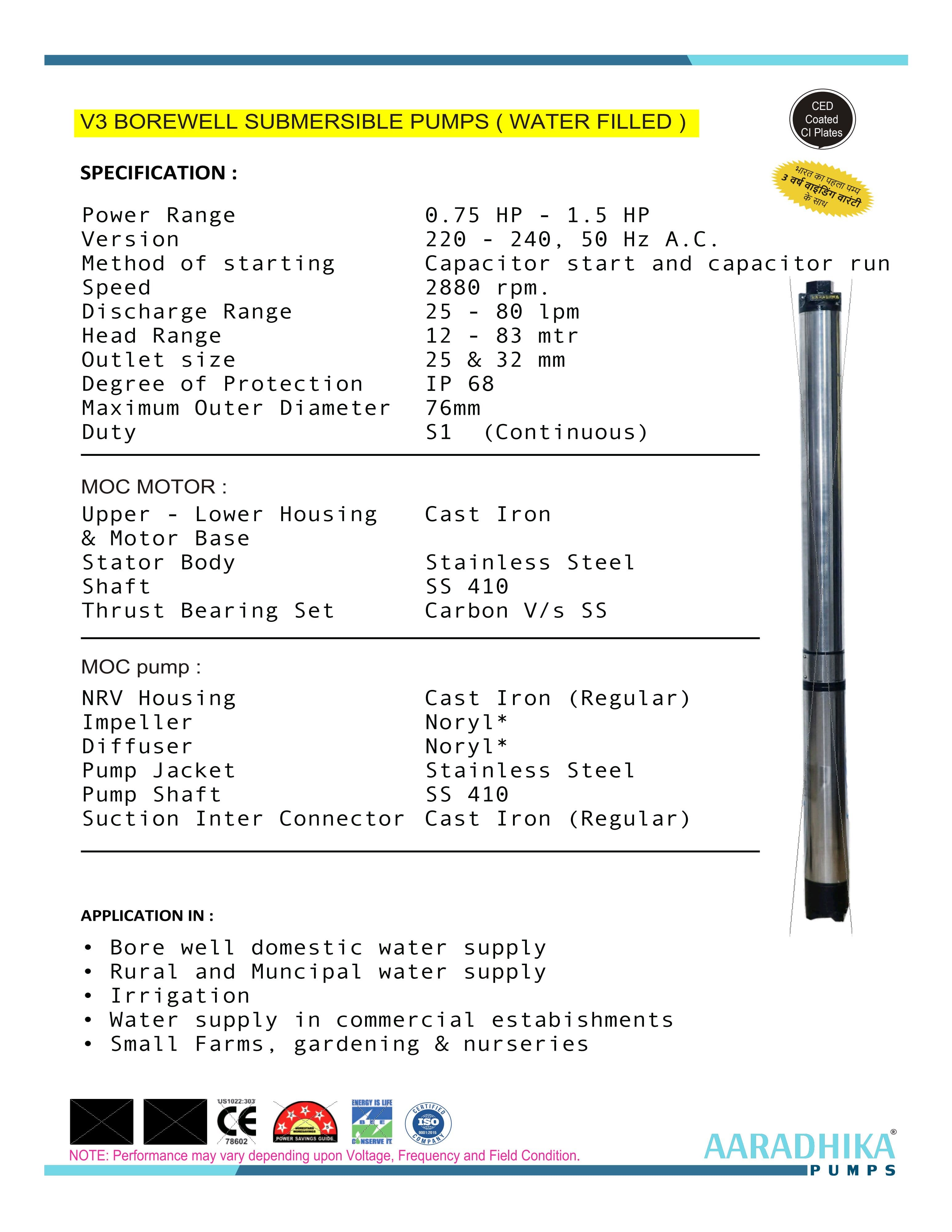 Power Range: 0.75 HP – 1.5 HP | Discharge: 25 – 80 LPM | Head Range: 12 – 83 Mtrs | Speed: 2880 RPM | IP 68 Protection