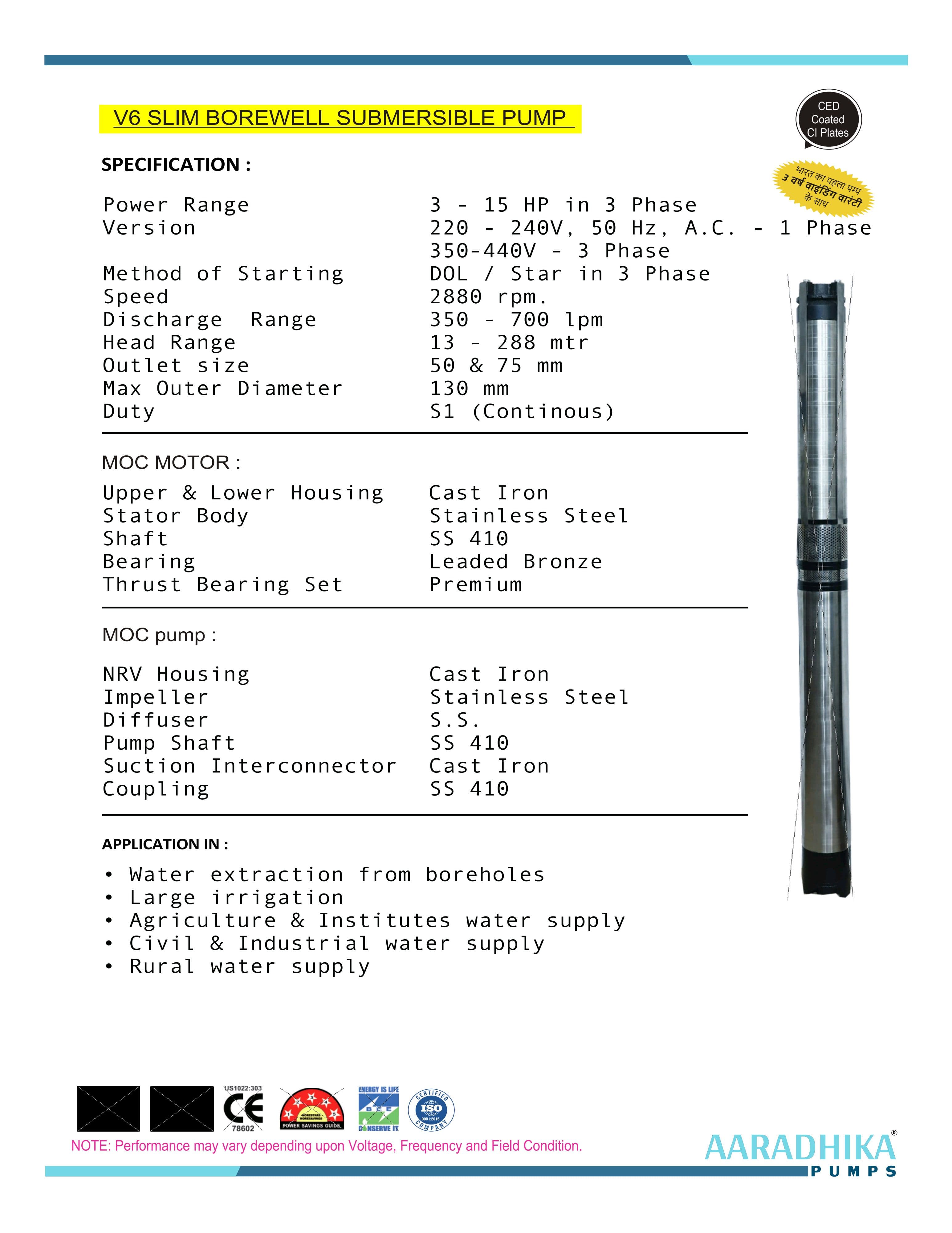 Power Range: 3 HP – 15 HP (3 Phase) | Speed: 2880 RPM | Discharge: 350 – 700 LPM | Head Range: 13 – 288 Mtrs