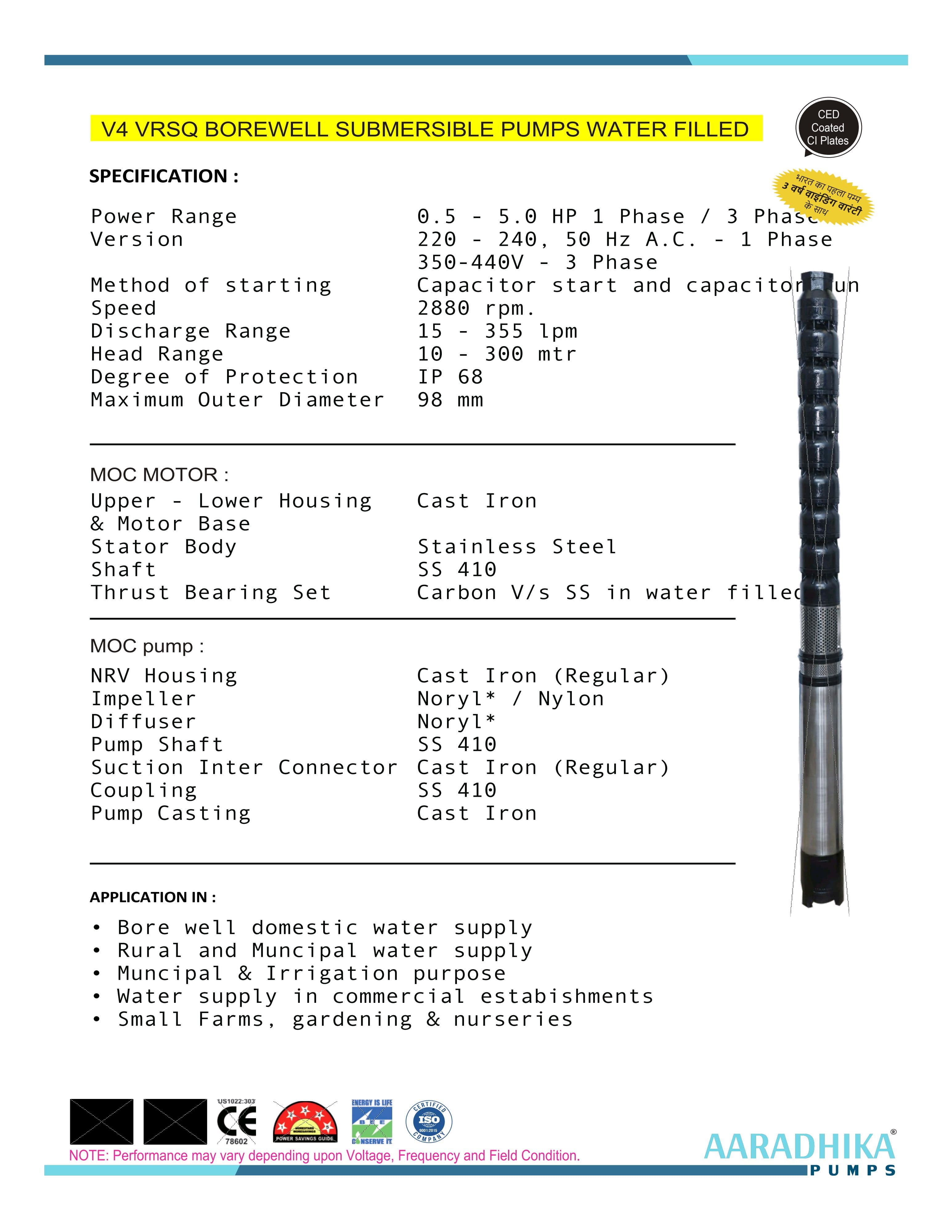 Power Range: 0.5 HP – 5 HP | Speed: 2880 RPM | Voltage Version: 220-240V (1 Phase) / 350-440V (3 Phase) | Discharge Range: 15 – 355 LPM | Head Range: 10 – 300 Mtrs | Protection: IP 68